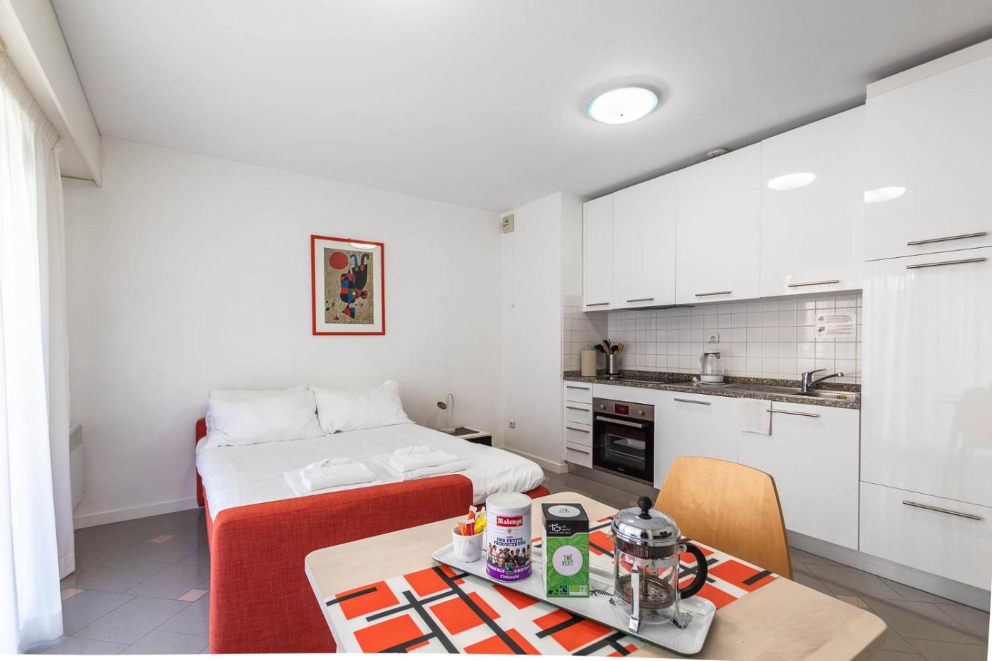 Studio Apartment. This apartment is comprised of 1 living room, 1 separate bedroom and 1 bathroom with a shower and free toiletries. The well-equipped kitchen features a stovetop, a refrigerator, kitchenware and an oven. The air-conditioned apartment offers a flat-screen TV with cable channels, a washing machine, soundproof walls, a tea and coffee maker as well as city views. The unit offers 4 beds. ;